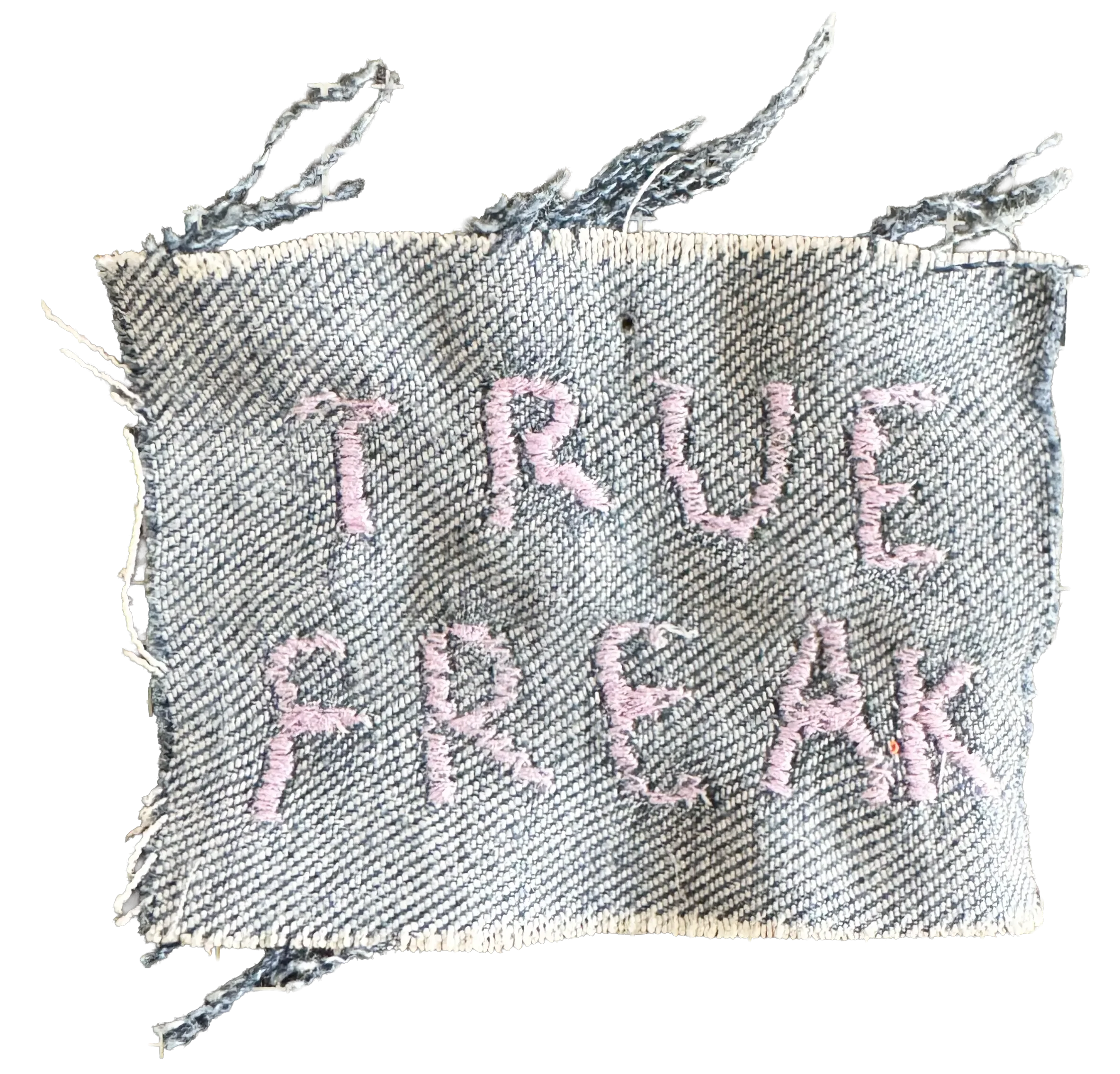 Un essai de broderie TRUE FREAK sur une chute de jean ;